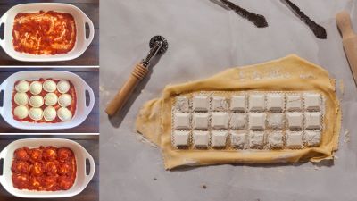 تكرر الطبقات بما تبقى من الرافيولي. يُنهى الطبق بالصلصة المتبقية والجبن. يرش مع البارميزان إذا كنت ترغب في ذلك.