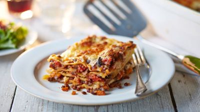 اخبزيها في فرن مسخن لمدة 25 دقيقة. اكشفي الغطاء عن الكسرولة واستمري في الخبز حتى تغلي اللازانيا وتتحول إلى اللون البني الفاتح ، حوالي 25 دقيقة أخرى. دعي اللازانيا ترتاح قبل 5 دقائق من التقديم.