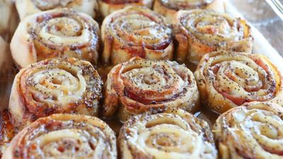 تخلط كمية من الزبدة والسكر البني وصلصة Worcestershire ، الخردل ، وبذور الخشخاش في وعاء على نار متوسطة. تخفق حتى تذوب الزبدة ويمتزج الخليط جيدا. تصب بالتساوي على اللفائف.