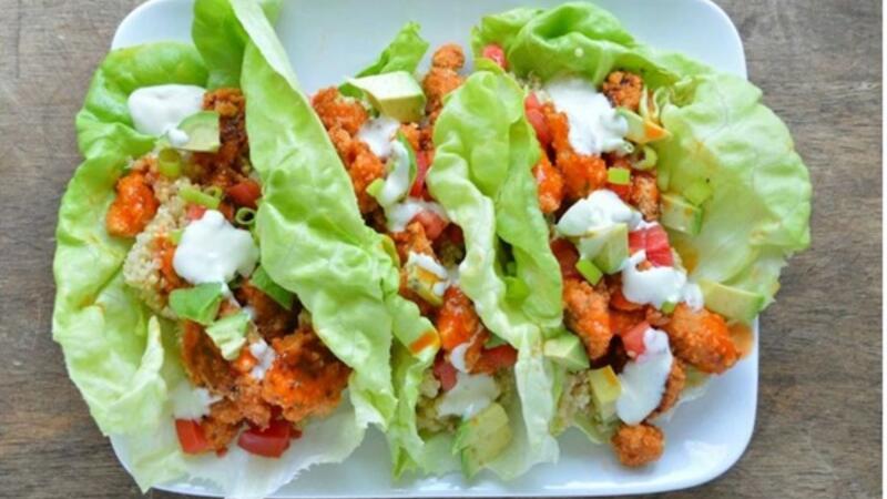 قطع الدجاج المتبلة بالصلصة الحارة والمقدمة في شرائح الخس المقرمشة.