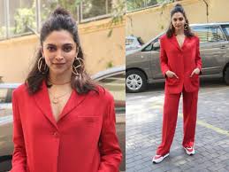 ظهرت ديبيكا بادكون هنا ببدلة باوفر سايز باللون الأحمر، ونسقت معها حذاء رياضيًا مميزًا وأقراطًا ذهبية ضخمة.