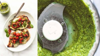 تُقلب الطماطم وعصير الليمون والريحان معًا. ضعي كل صدر دجاج مع 3 ملاعق كبيرة من البيستو ، ومغرفة من الطماطم ، وبعض الفلفل الأسود المطحون قدميها على الفور.
