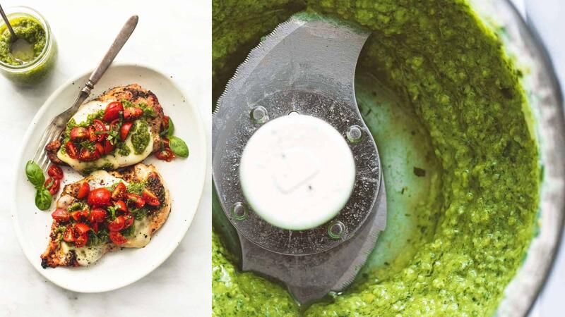 مارغريتا الدجاج المشوي سهلة وصحية مغطاة بجبنة الموزاريلا المذابة ، البيستو ، وريحان الطماطم.