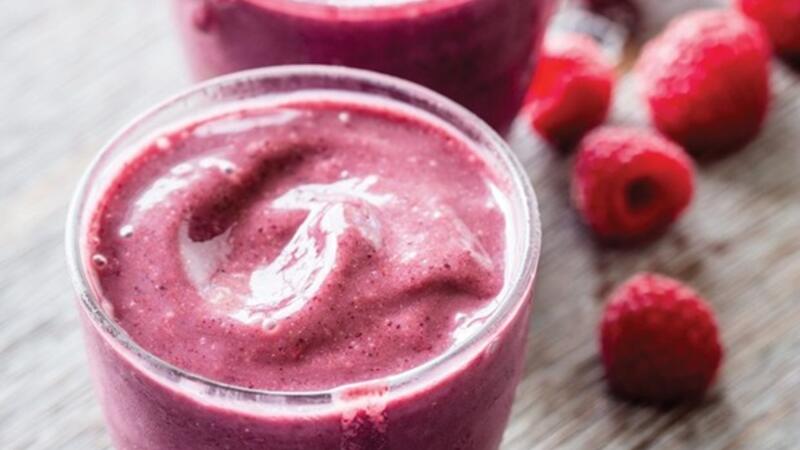 يوضع جل الشيا ، التوت المجمد ، الهيل ، حليب اللوز، العسل ، الفانيليا ، والأفوكادو في الخلاط. يغطى ويخفق جيدا حتى يتجانس.