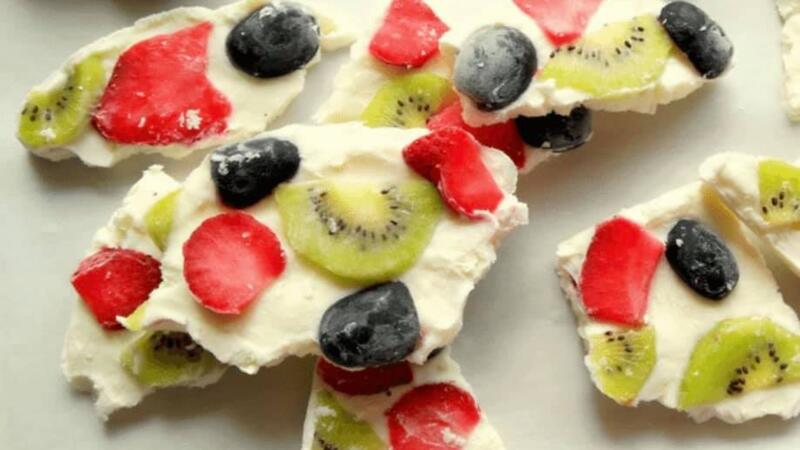 - توزع قطع الفواكة على الوجة ويضغط عليها قليلا لتلتصق باللبن.