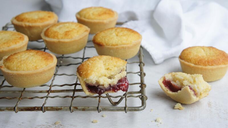 اخفقي الزبدة والسكر والبيض والحليب المبخر وخلاصة الفانيليا واخلطيهم جيدًا. يضاف جوز الهند ويقلب. ضعي 1/2 ملعقة صغيرة من المربى في كل تارت صغيرة ، واملئيها بحوالي 1 ملعقة كبيرة من مزيج جوز الهند.