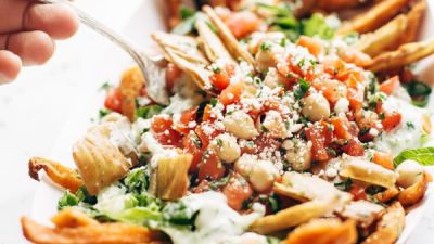 التجميع: توضع طبقات من البطاطس الحلوة والخبز المقرمش وصلصة الحمص والخس والجبن واللبن وتقدم في طبق كبير للمشاركة.