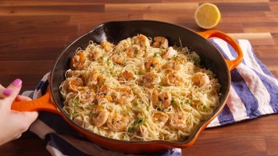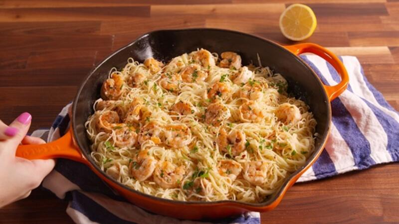 معكرونة بالجمبري والصلصة لوجبة غداء شهية..