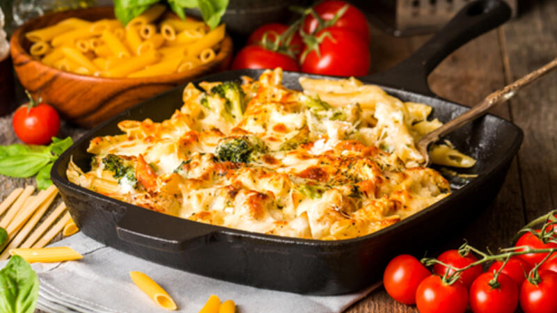 - يسخن الفرن على درجة حرارة 180 مئوية وتدهن الصينية بالزيت أو السمن، ويوضع فيها خليط المكرونة والخضروات ثم يوضع البشاميل فوق المكرونة، ويرش فوقه الجبنة المبشورة ثم يدخل الفرن لمدة من 30 إلى 40 دقيقة.