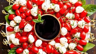 تغسل الطماطم وتجفف. ترتب في دائرة على طبق كبير أو طبق دائري. تصفى كرات الموتزاريلا وترتب بين الطماطم.