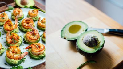 مقبلات الروبيان المتبل على شرائح الخيار المقرمشة مع أفوكادو والصلصة .