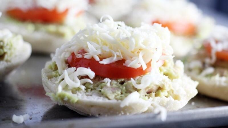 توضع انصاف الكعك على ورقة الخبز. توضع كمية من خليط التونة والأفوكادو على كل نصف ثم توضع شريحة من الطماطم والجبن فوقها.