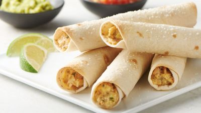 - تسكب كمية مناسبة من خليط الدجاج على التورتيلا ، وتلف بإحكام قدر الإمكان، ثم توضع جانباً على طبق غير لاصق. تدهن كل لفافة تورتيلا بزيت الزيتون أو ترش برذاذ الطبخ غير اللاصق. تخبز لمدة 15-20 دقيقة حتى تصبح الميني تاكو ساخنة ومقرمشة.