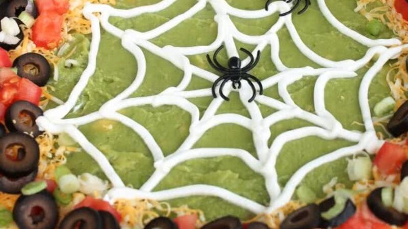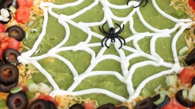 في وعاء صغير تخلط التوابل مع الفاصوليا. يوضع الخليط بالتساوي على طبق 11 بوصة قرب الحافة. ثم ينشر 3/4 كوب من القشدة الحامضة على خليط الفول. ثم تضاف الصلصة بلطف على القشدة الحامضة. ثم يوضع خليط الافوكادو على الصلصة. وأخير تفرد الجبنة المبشورة. وفوقها توضع حبات الزيتون، ومكعبات الطماطم، وشرائح البصل الأخضر. مع ¼ كوب من القشدة الحامضة المتبقية، يوضع في كيس بلاستيكي ويقص طرفه ثم تضغط القشدة الحامضة على شكل شبكة عنكبوت. تزين بالعناكب البلاستيكية.