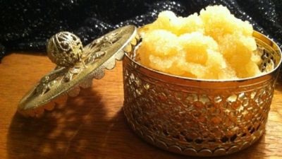 تخلط المكونات في وعاء صغير. يوضع الخليط في وعاء محكم. للاستعمال ، يطبق القليل من الكريم على الجسم الرطب أو الجاف (ما عدا الوجه) ، يفرك بلطف بحركة دائرية. يتركه لبضع دقائق ، ثم يغسل.