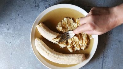 تهرس المكونات بالشوكة. لا تفرط في الهرس . إذا كنت تريد استخدام الموز لعمل مقشر للوجه، يهرس الموز بشكل منفصل دون السكر. مع تجنب منطقة العين.