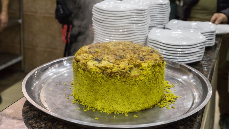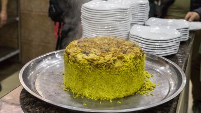 - بعد أن ينضج المقادير ثم يُقلب في طبق كبير، وتُقدّم مع المكسّرات مثل اللوز، الصنوبر المقليّان ويقدم مع الخيار واللبن أو السلطة التقليدية.