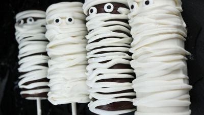 تكرر نفس الخطوات باستخدام الشوكولاتة الخام المذابة ثم توضع 2 حبة من حلوى العيون في الجزء الأعلى من رأس مومياء المارشميلو.