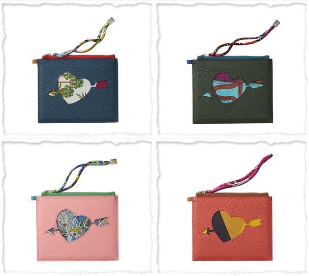 الآن استخدمت هيرميس نفس الحرير لعمل هذا القلب على المحافظ الجديدة، ولكن للداخل فقط. التصميم الخارجي مصنوع من جلد العجل وقد وضعت هيرميس عمدا نمطا القلب البارز لتسليط الضوء على جمال المنطقة الداخلية. هذه الحقيبة لا تأتي مع حزام للكتف، لكنها تأتي مع حزام للمعصم.