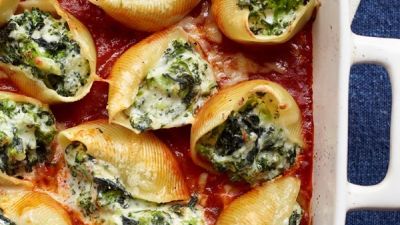 تعصر السبانخ باليد للتخلص من الرطوبة الزائدة ، ثم توضع في وعاء كبير. تقطع البروكلي وتضاف إلى الوعاء. تضاف جبنة الريكوتا وجبنة البارميزان و 1/2 كوب من جبنة الموزاريلا و 1/2 ملعقة صغيرة من الملح والفلفل. يُسكب المزيج في الأصداف (حوالي 1/4 كوبًا) ويوضع فوق الصلصة.