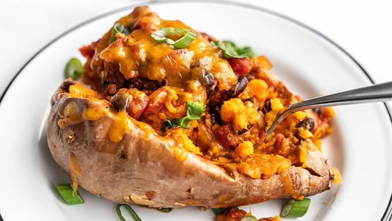 وصفات خريفية: بطاطا تركية بالفلفل الحار بطاطا حلوة طرية مخبوزة مع شرائح الديك الرومي والفاصوليا والفلفل الحار، ثم مغطاة بجبن الشيدر المملح. البطاطا الحلوة التركية بالفلفل الحار هي عشاء سهل!