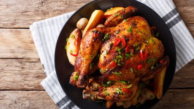 يتبل الدجاج بالملح والفلفل الأسود جيدا.