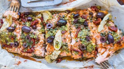 - قم بإزالة السمك من الفرن، ثم قص الخيط. تقطع إلى أجزاء بحجم صغير وتقدم مع اختيارك من الأطباق الجانبية.