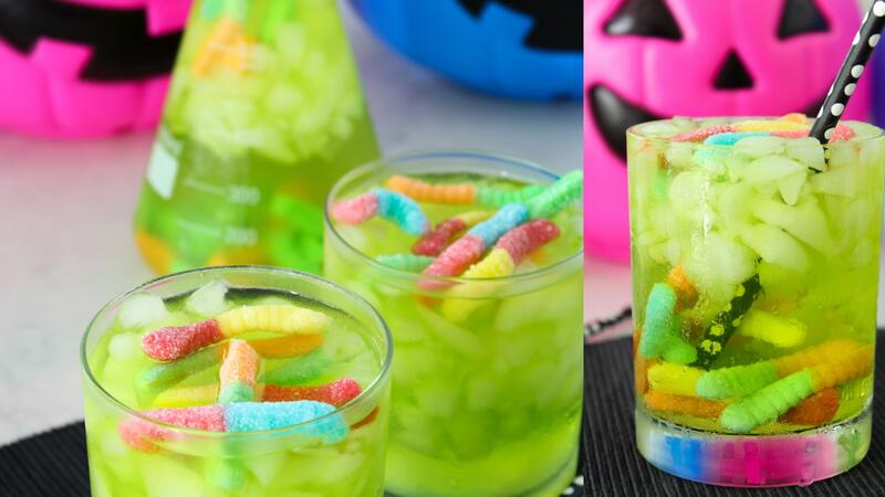 تصب أجزاء متساوية من عصير التفاح الأخضر والشراب الغازي على الديدان.