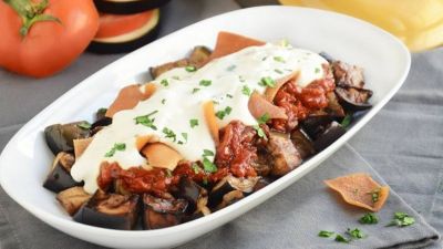 5. أضيفي البصل المقلي والباذنجان وصلصة الطماطم.
