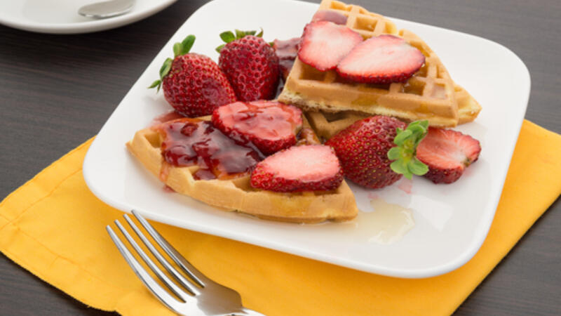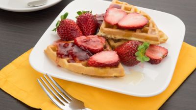 •رشي مسحوق السكر الناعم ووزعي شرائح الفراولة على سطح الوافل ثم قدميه، صحتين وهنا.