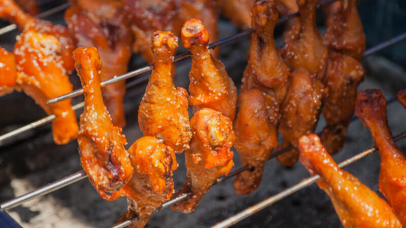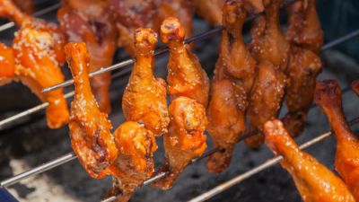 5. سخنى المقلاة وحمرى الدجاج لمدة 3-4 دقائق على كل جانب -قومى بذلك على دفعات، وحافظى على الأسياخ المطبوخة فى فرن دافئ.