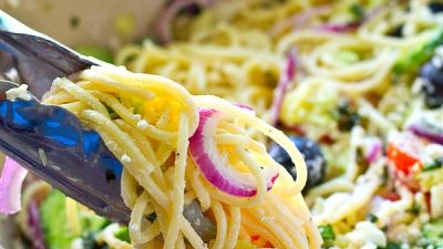 في وعاء كبير ، تخلط المعكرونة السباغيتي ، الخيار ، الطماطم ، الزيتون ، البصل ، الخس ، الجبن ، والريحان. وتوضع جانبا.