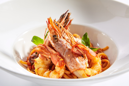 جمبري مقشر مع الأفوكادو المدخن والخوخ
