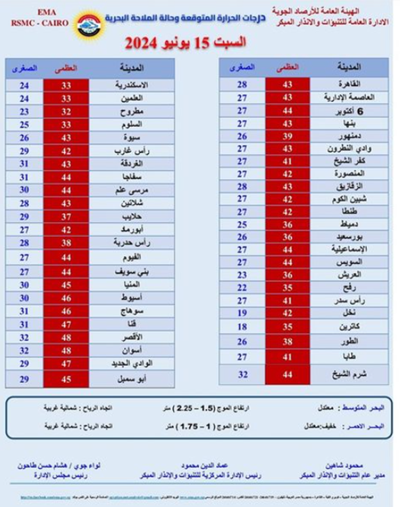 في صباح اليوم الخميس 15 يونيو 2024 الموافق 9 ذي الحجة 1445 هـ قامت الهيئة العامة للأرصاد الجوية المصرية ببث بيانها العاجل حيال طقس مصر اليوم؛ وذلك من أجل إطلاق مجموعة من التحذيرات يجب على كافة السكان توخي الحيطة حيالها.