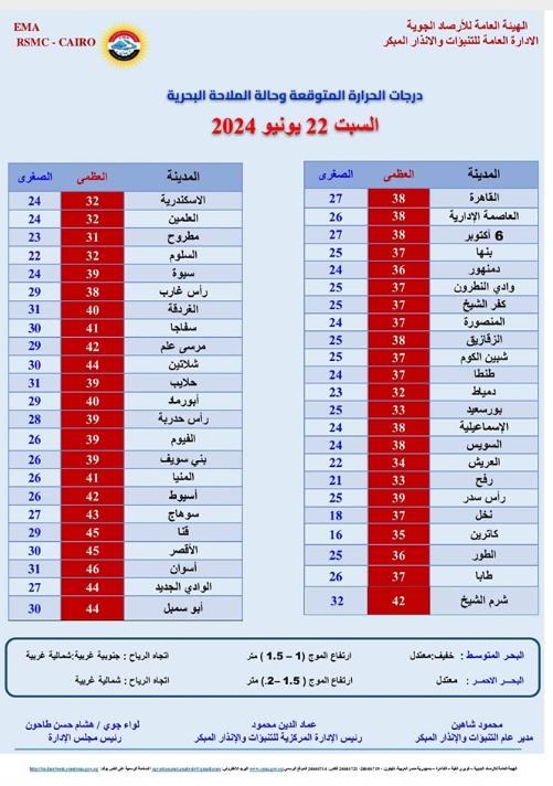 في هذا السياق أعلنت الهيئة العامة للأرصاد الجوية المصرية عن بيانها الخاص بحالة الطقس اليوم السبت 22 يونيو 2024؛ وهو ما اشتمل على تحذير جديد من مواصلة هذا الارتفاع في درجات الحرارة بما يتراوح مقدارها بين 2 – 3 درجات.