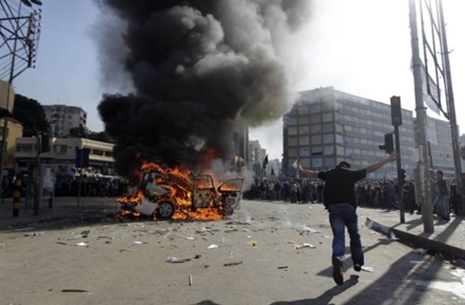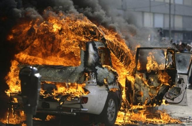 أنصار تيار المستقبل الموالي لسعد الحريري يشاهدون احتراق سيارة قناة "الجزيرة".