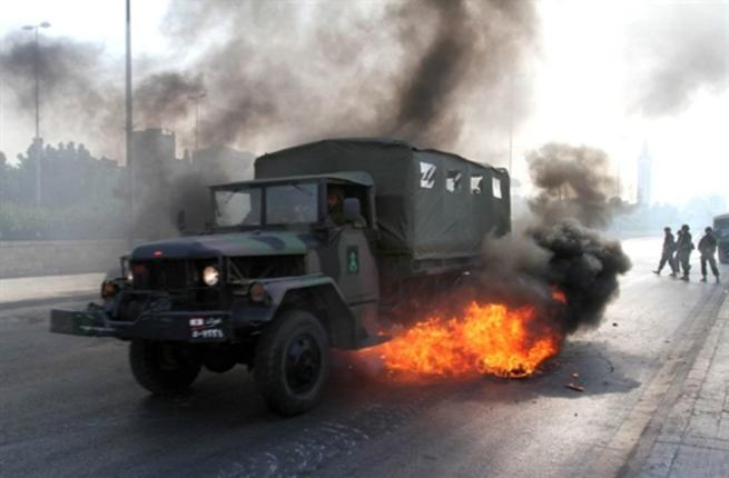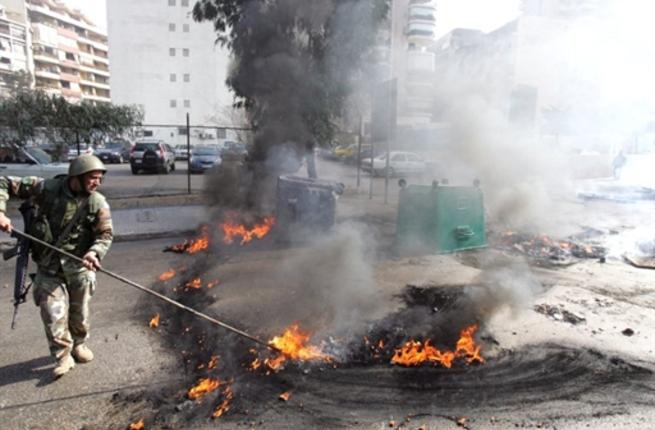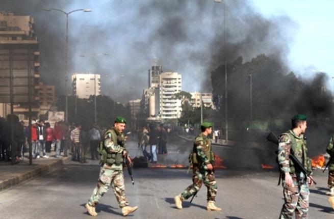 الجيش اللبناني ينتشر في الطرقات خلال تظاهرات قام فيها أنصار تيار المستقبل بإحراق الإطارات في ضواحي العاصمة بيروت.