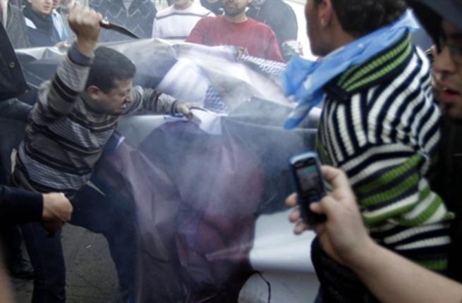 أنصار تيار المستقبل يمزقون صورة لرئيس الوزراء اللبناني الجديد نجيب ميقاتي.
