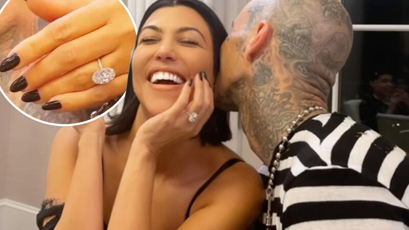 اشيع خبر خطوبة نجمة تلفزيون الواقع كورتني كاداشيان بحبيبها المغني الأمريكي ترافيس باركر بعد انتشار صور تجمعهما وهي مرتدية خاتم خطوبة ألماسي ضخم.