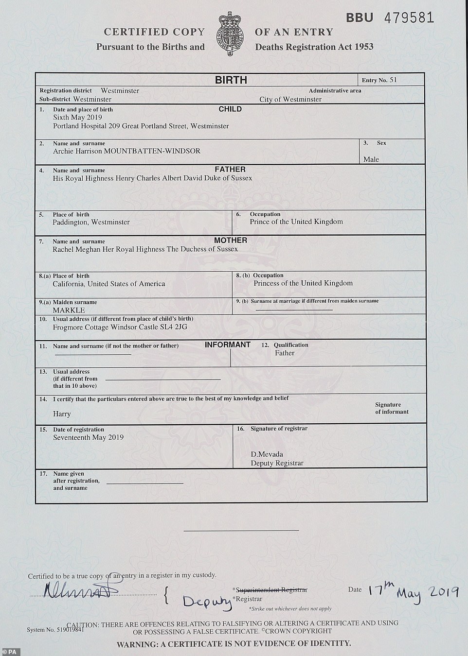 حتى الآن يحاول الأمير هاري وميغان الحفاظ على سرية تفاصيل ولادتها وطاقمها الطبي، لكن شهادة الميلاد من مكتب التسجيل كشفت عن بعض التفاصيل الأساسية، حيث تؤكد أن آرتشي هو الإسم الكامل للطفل، وليس اختصاراً لشيء آخر، كما أن اسم ميغان الأول هو راتشيل.
