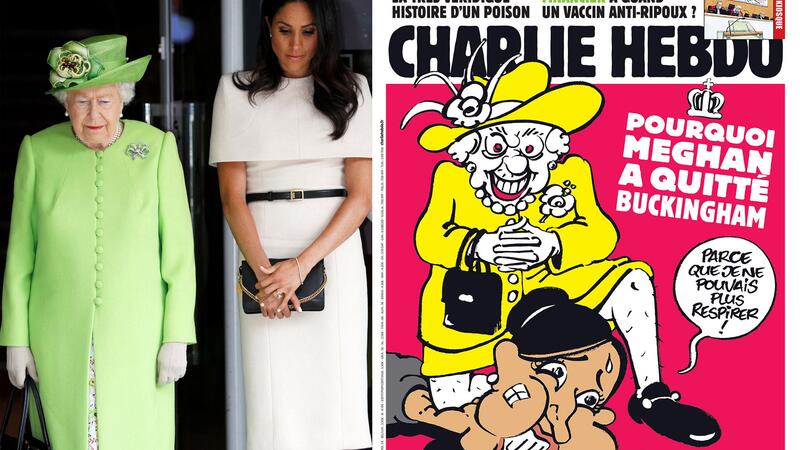 تعرضت مجلة شارلي إبدو لهجوم بسبب غلافها الأخير الذي يُظهر الملكة إليزابيث الثانية تضع تضع ركبتها على رقبة دوقة ساسكس ميغان ماركل في محاكاة ساخرة لموت جورج فلويد.
