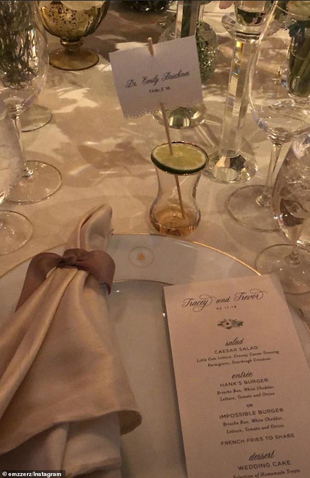 وأقيمت الاحتفالات في حفل زفاف ضخم في منتجع Rosewood Miramar Beach، حيث تم تصوير الثنائي أثناء رقصتهما الأولى، بينما كانت العروس تريسي ترتدي فستاناً أبيض، بقصة الباكلس، ومزيّن بذيل طويل، وكان تريفور متألقاً ببذلة سوداء، وظهرا في لقطة أخرى وهما يقبلان بعضهما البعض، عند قولها "أنا أوافق".