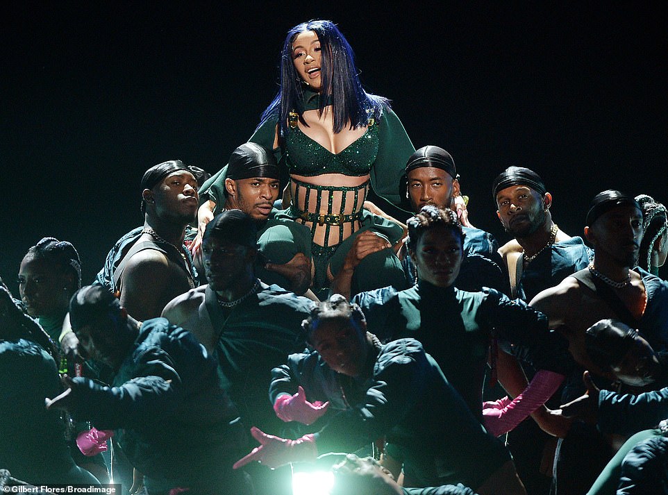 وقد افتتحت المغنية العالمية الحفل بأداء مُثير على خشبة المسرح برفقة الراقصين المساعدين، كما أدَّت رقصة تعري في أحضان زوجها مغني الراب "أوفست"، واستعرضت جسدها بملابس جريئة خضراء.