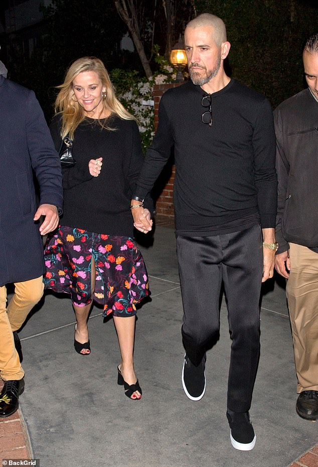 وكعادتها بدت الممثلة الموهوبة ريس ويذرسبون مذهلة بإطلالتها الوردية، حيث ظهرت بفستان أسود مطبوع عليه ورود ملوّنة، ومزيّن بشق أمامي، وارتدت فوقه بلوزة سوداء من الصوف الناعم، كما نسّقت معه صندل مفتوح وحقيبة يد مطابقتين للون البلوزة، بالإضافة إلى أنها كانت تمسك بيد زوجها "جيم توث" وهي تدخل مكان الاحتفال.