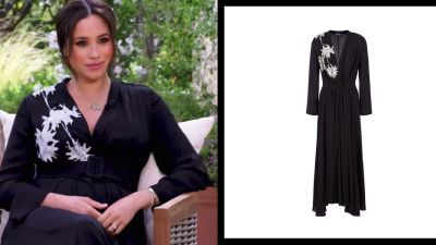 من أجل هذا اللقاء الذي سيكشف أسرارًا كثيرة، ارتدت دوقة ساسكس سابقًا فستانًا من الحرير الأسود من دار الأزياء العالمية "جورج آرماني" والذي جاء بفتحة صدر على شكل حرف V وبتفاصيل بيضاء ناحية الجهة اليمنى من الكتف، إضافة إلى حزام من نفس لون الفستان حدد خصرها، وبلغت تكلفته 4700 دولار أمريكي.