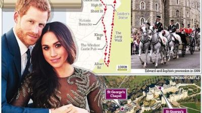 كشف القصر الملكي اليوم تفاصيل جديدة عن زفاف الأمير هاري وميغان ماركل الحاصل في الـ 19 من شهر مايو المُقبل، وفي الوثيقة الملكية الصادرة عن القصر، ينوي الأمير والعشيقة العودة بنا إلى زمن التّنقل بالعربات التي تجرّها الأحصنة، والظهور العلني أمام عامّة الشعب ضمن موكبٍ ملكي استثنائي بين القِلاع الإنجليزية العتيقة.