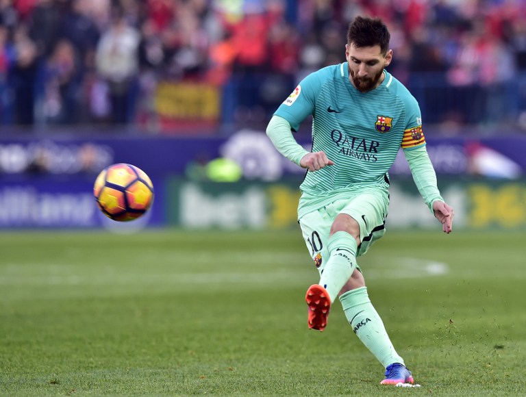 النجم ليونيل ميسي خلال المباراة التي جمعت فريقه برشلونة بمستضيفه أتلتيكو مدريد على ملعب فيسنتي كالديرون ضمن الجولة الـ 24 من الدوري الإسباني، والتي انتهت بفوز البارسا بهدفين لهدف.