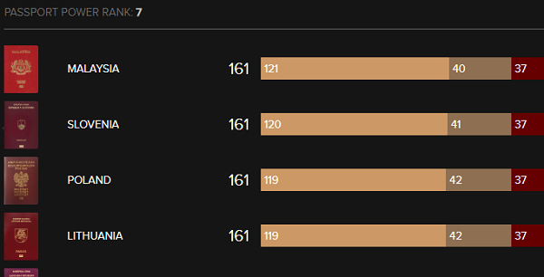 وبحسب مؤشر "باسبورت إندكس" الذي يعد نظامًا تفاعليًا يختص بتصنيف قوة جوازات السفر، فإنه يمكن لحامل الجواز الإماراتي السفر إلى 167 دولة دون الحاجة لتأشيرة مسبقة وبذلك يمكن للمواطن الإماراتي السفر إلى 84 في المائة من الدول المدرجة في المؤشر دون تأشيرة فيما قفز جواز السفر الإماراتي من المرتبة 27 في ديسمبر 2016 إلى المرتبة الأولى عالميًا في ديسمبر 2018.