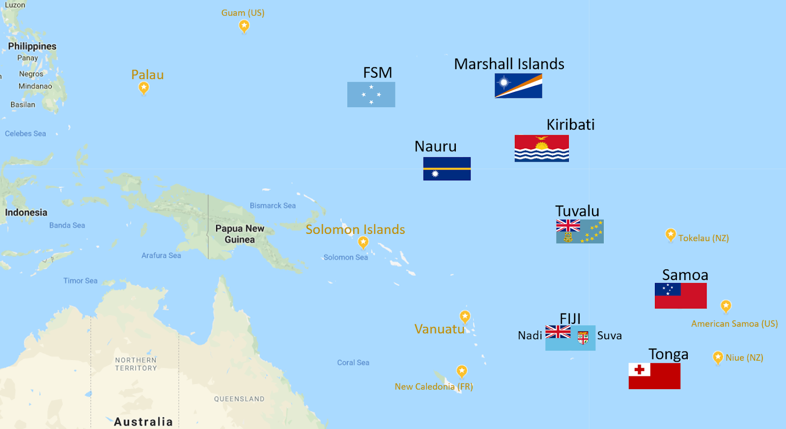 قارة أوقيانوسيا: جزر سليمان، وجمهورية ناورو، وجمهورية فانواتو، ودولة ساموا، وجمهورية كيريباتي، وولايات مايكرونزيا المتحدة، ومملكة تونغا، وجمهورية جزر مارشال، وجمهورية بالاو، ودولة توفالو.