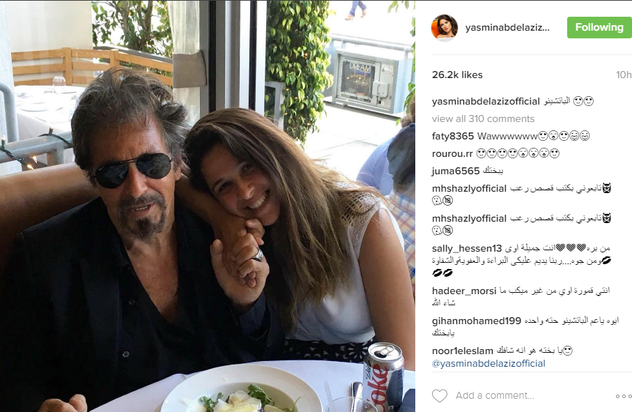 فاجأت الفنانة ياسمين عبد العزيز جمهورها بظهورها بصحبة الفنان العالمى آل باتشينو أثناء تناول الغداء معه خلال رحلتها الحالية إلى الولايات المتحدة الأمريكية ونشرت ياسمين صورتهما عبر صفحتها الرسمية على “إنستجرام” دون الكشف عن سبب اللقاء.